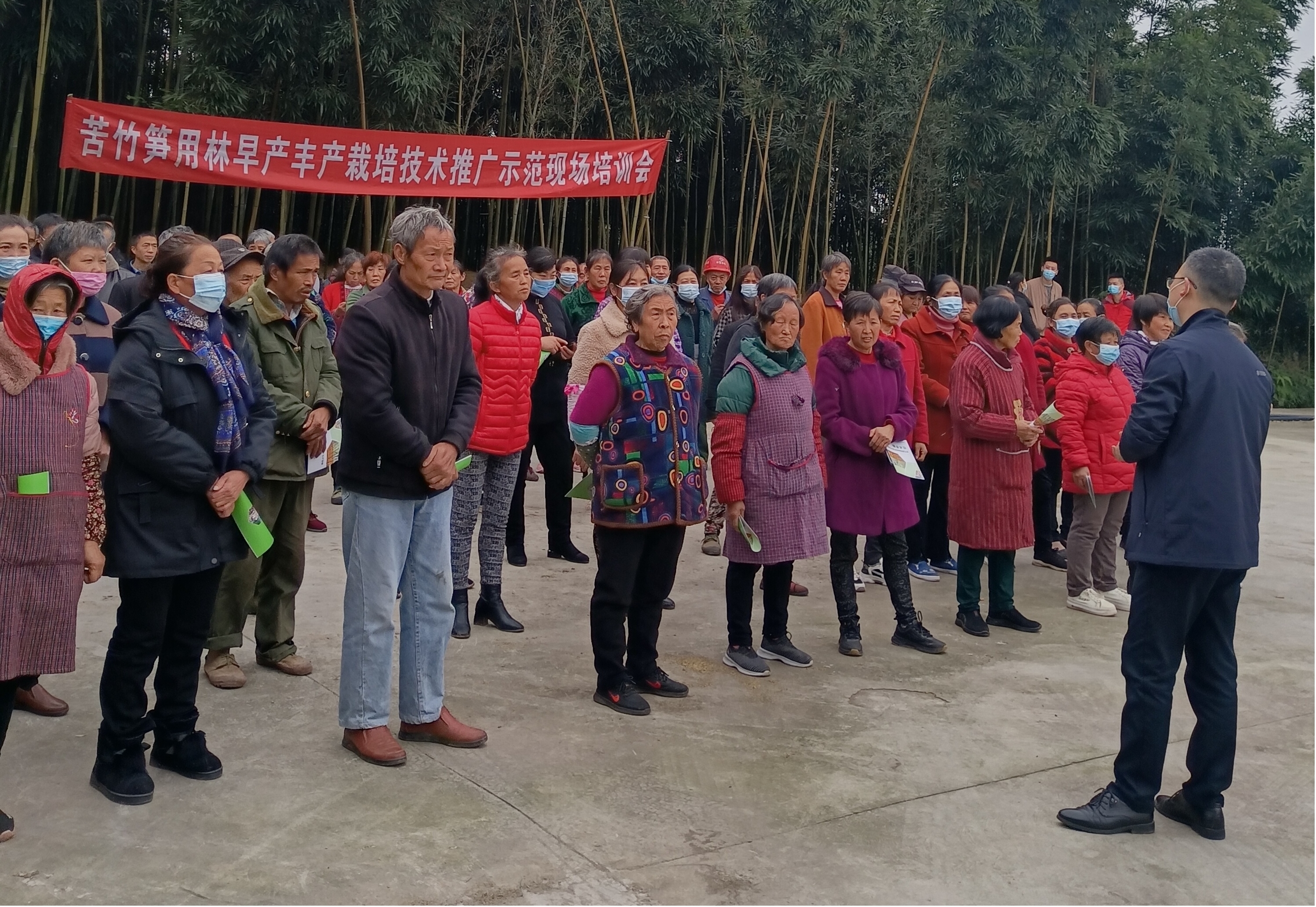 项目组成员,高级工程师易桂林,对竹林结构调整,覆盖增温促笋,水肥措施管理,笋后竹林管理等技术措施进行了详细的讲解,对覆盖竹林地选择,覆盖时间,逐层覆盖,温度控制 樱花影视网,撤出覆盖物等主要做法进行了现场示范,培训期间发放《苦竹笋用林早产丰产经营技术手册》约90份。